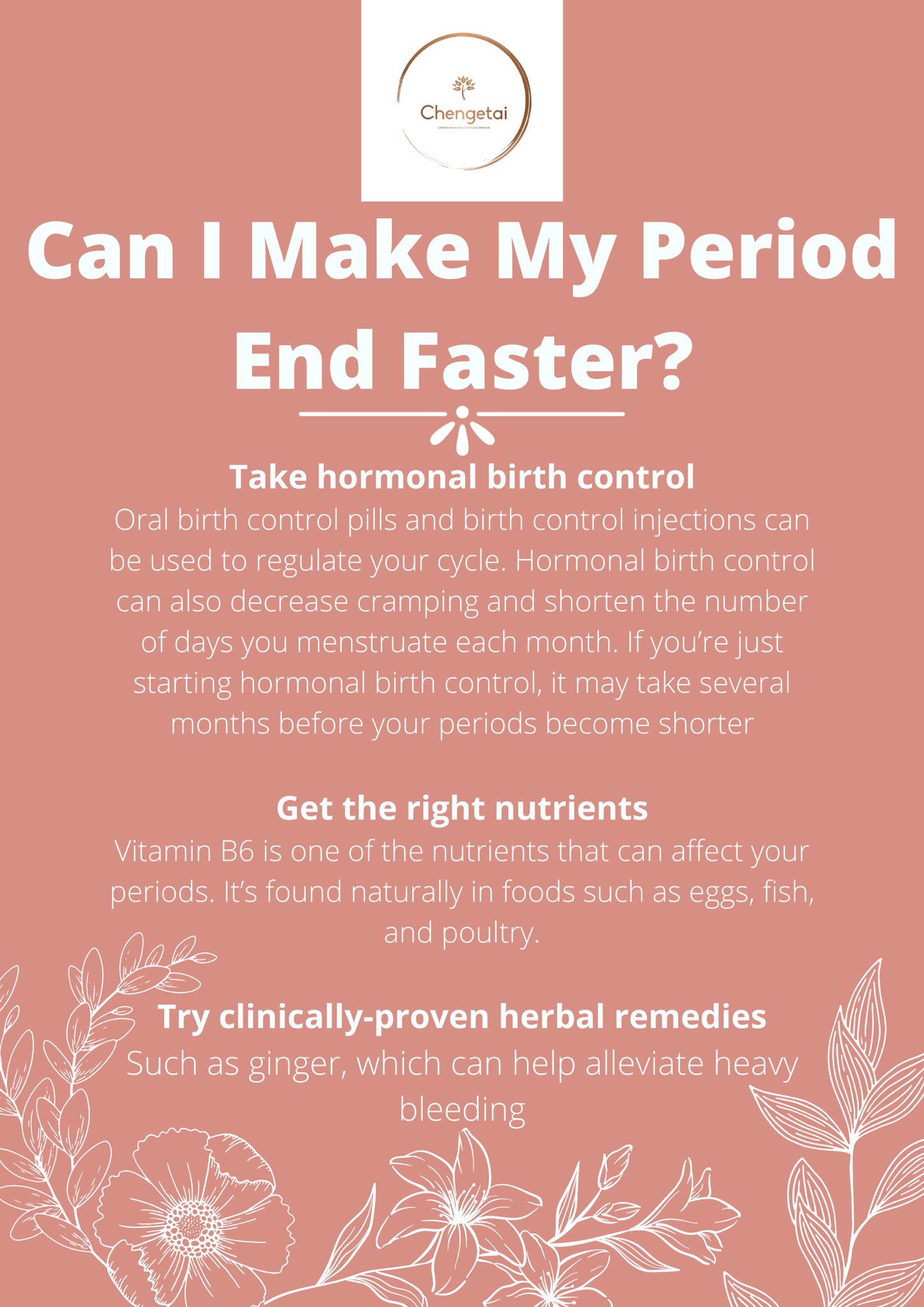 How to get your period faster 1. Learn how you can safely make your period end faster and possibly even lighten your menstrual flow.article: But if you’re on your period, try to drink more than eight glasses a day.